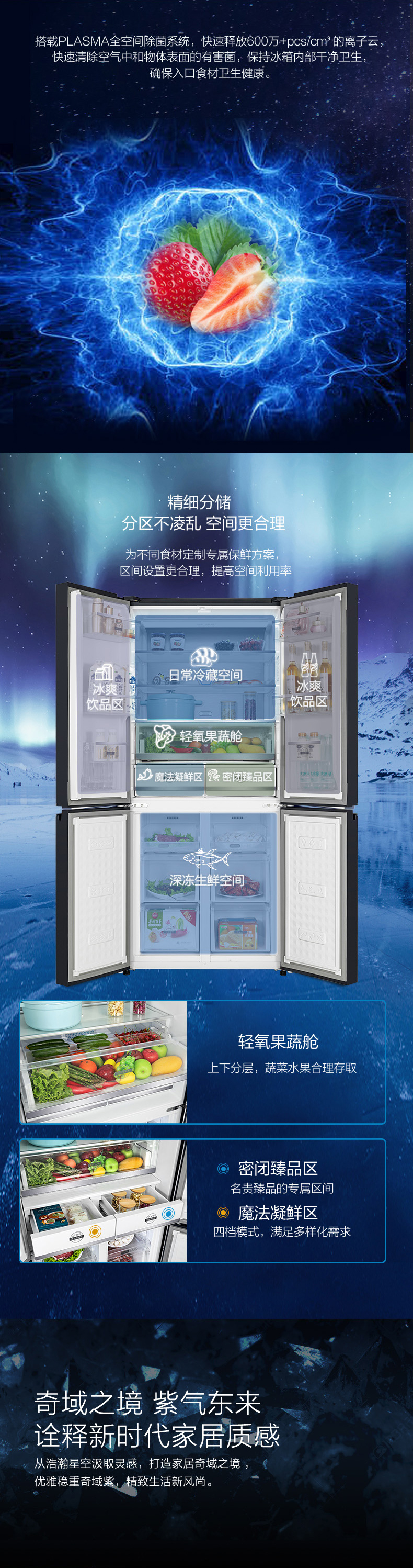 針對每種食材進(jìn)行精細(xì)化分區(qū),定制專屬保鮮艙,涵蓋肉類保鮮、果蔬保鮮、母乳儲存、干貨儲存以及除菌凈味五個維度,確保每一件食材的新鮮儲存