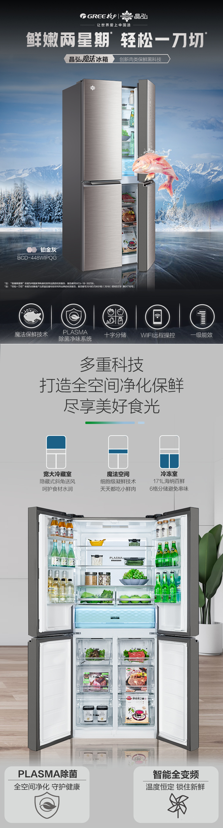 搭載-5℃嫩凍凝鮮科技,鮮嫩兩星期,輕松一刀切。Plasma等離子除菌凈味,除菌保鮮,長(zhǎng)久新鮮。4檔保鮮模式,多重角色時(shí)刻新鮮。