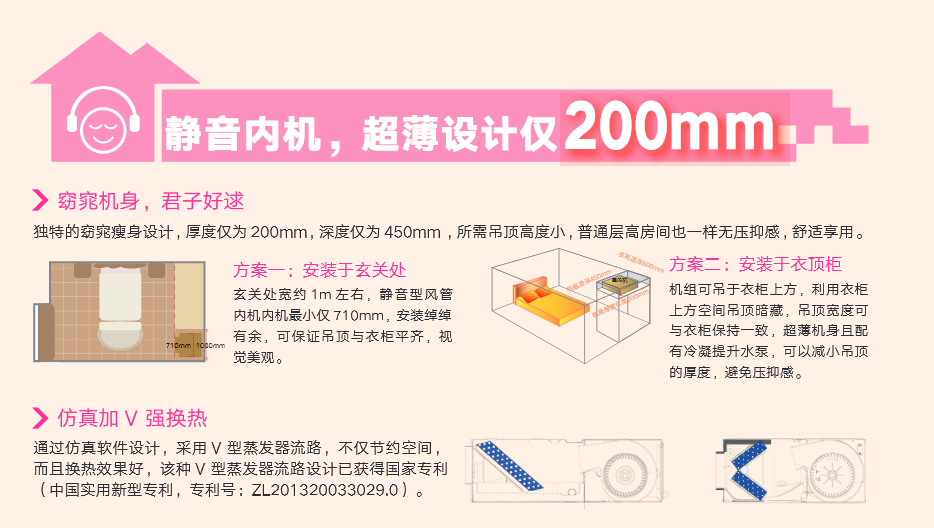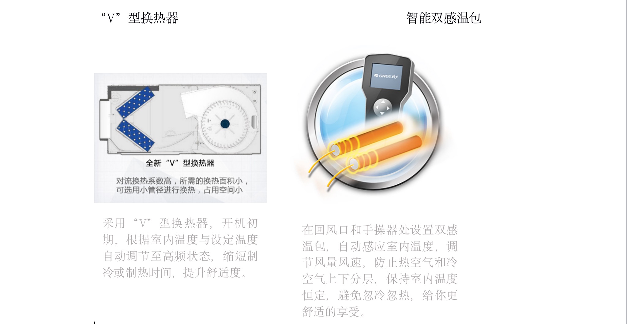 采用“V”型換熱器,開(kāi)機(jī)初期,根據(jù)室內(nèi)溫度與設(shè)定溫度自動(dòng)調(diào)節(jié)至高頻狀態(tài),縮短制冷或制熱時(shí)間,提升舒適度